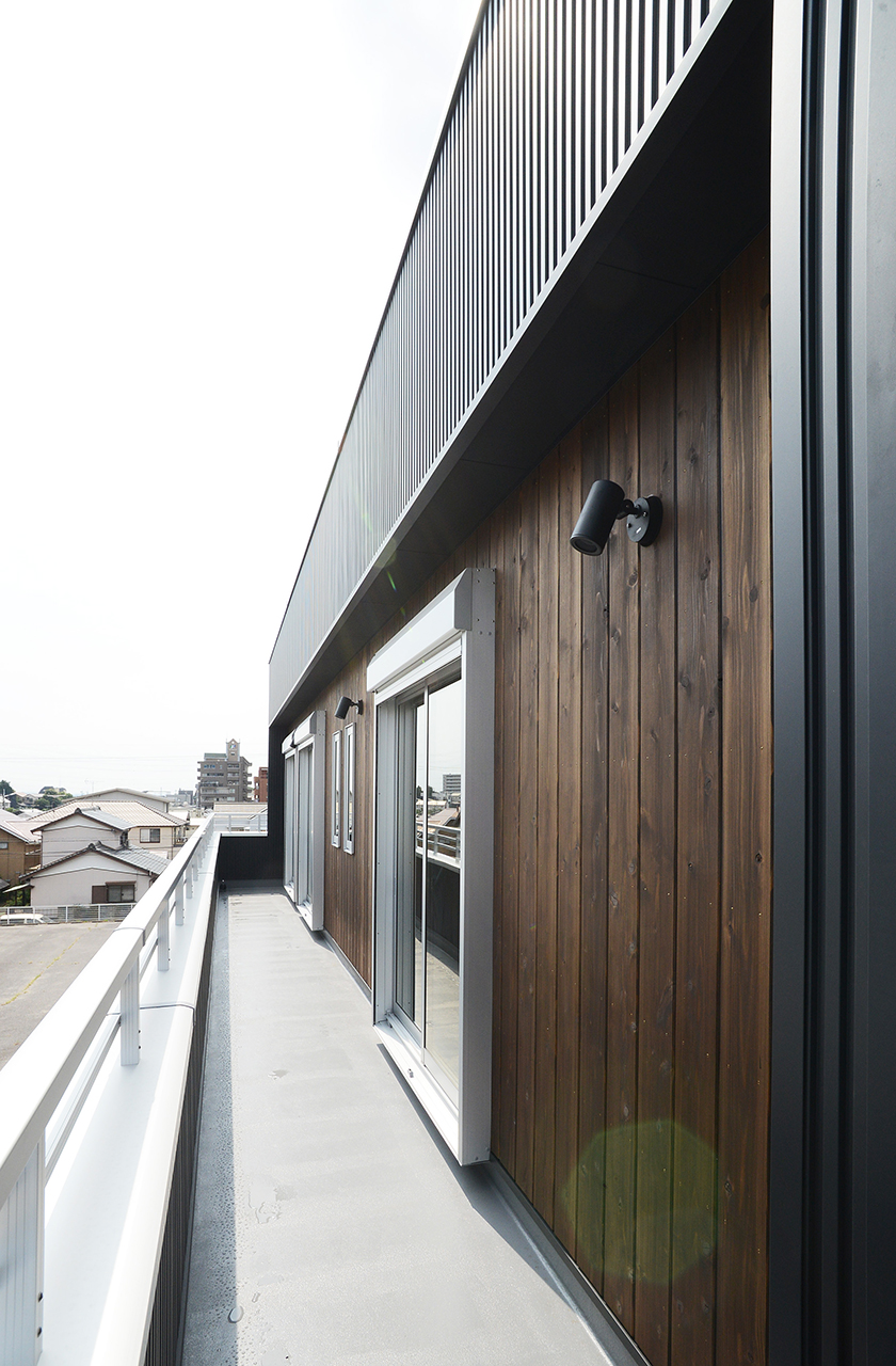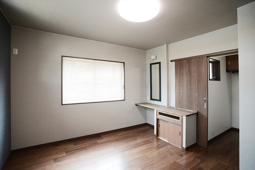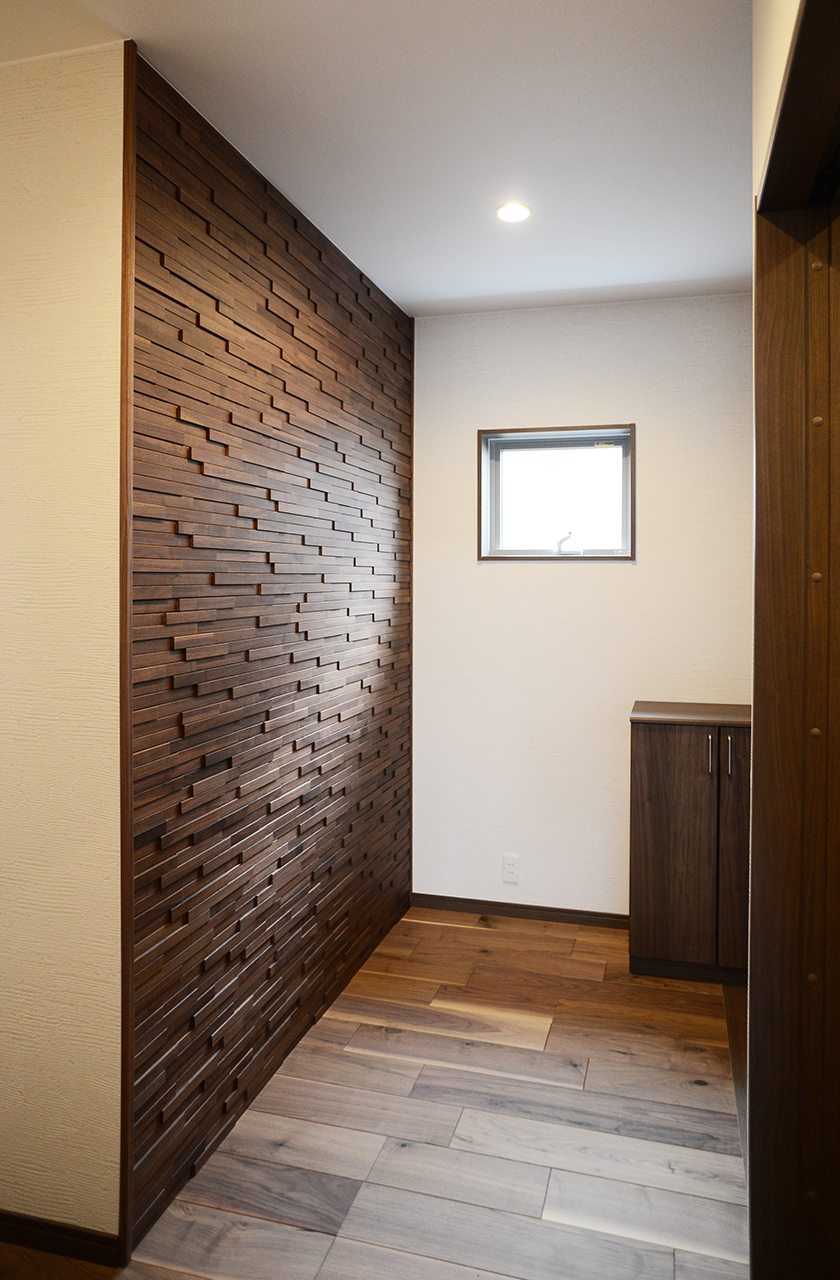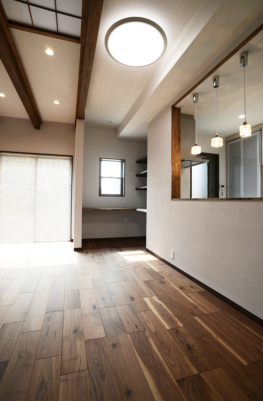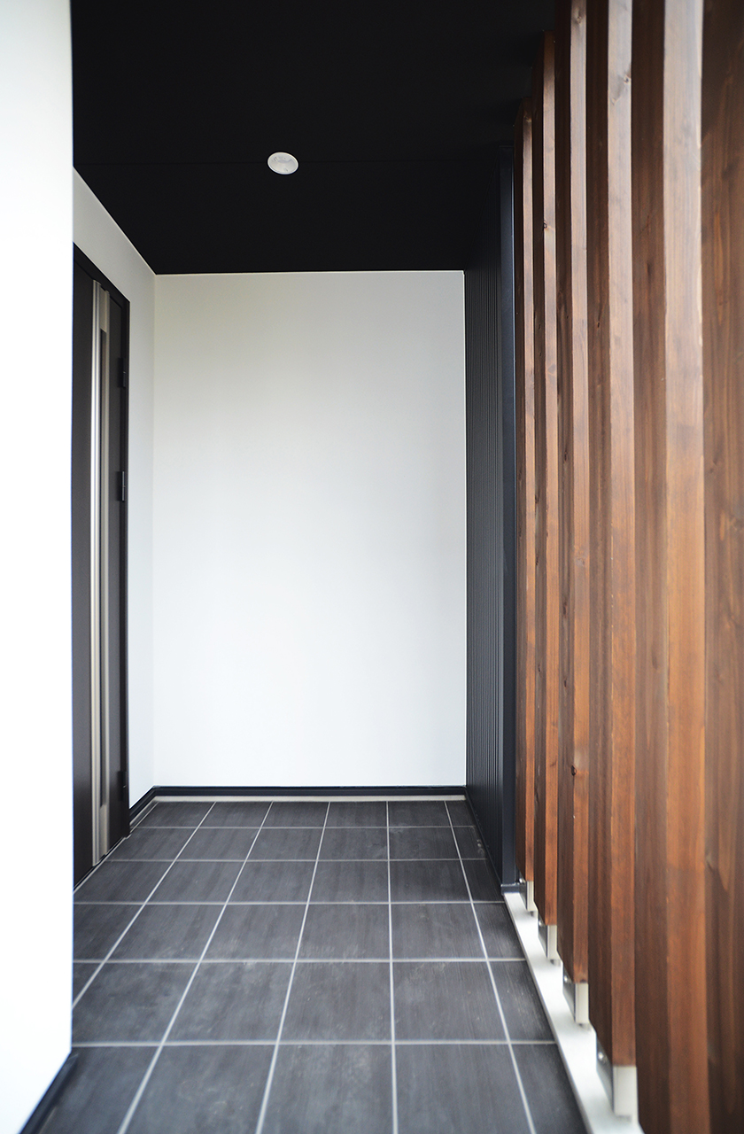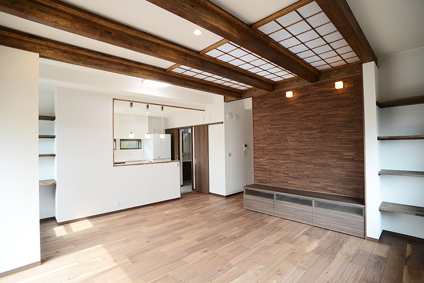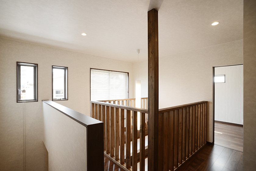 ココワホームが最も得意とする和モダン住宅を希望されていたご夫婦です。玄関ポーチや木材などの素材は古き良き空気感を大切にご提案。2階の窓から取り込んだ光が1階リビングまで届く吹き抜けを設けて、リビングの天井には格子状に障子を施しました。障子越しの光はとても美しく、私たちの自信作のひとつでもあります。