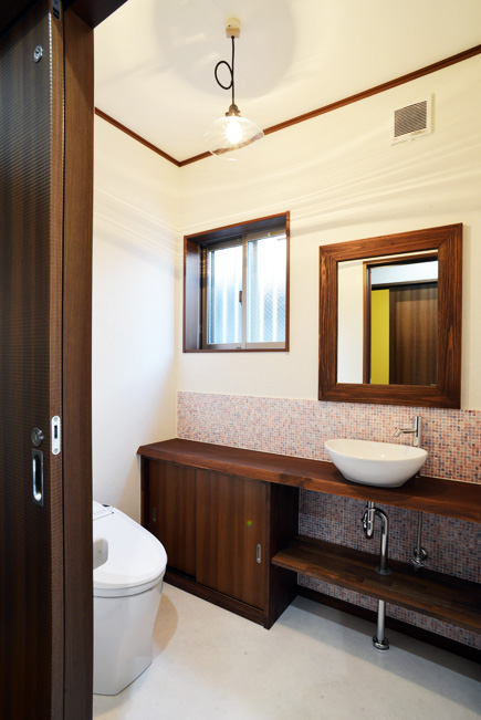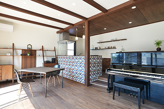 新 築 和カフェ風の住まい デザインのヒントはヒアリングで聞いた「古民家カフェが好き」のひと言でした。キッチンを小上がりにしてリビングとの境界線を強くすれば、お客様の目が届きにくく生活感もグッと薄くなります。アンティークな雰囲気を演出するために、建具は古材風の素材のをピックアップ。引き戸の格子柄や丸窓など、ご家族の好みにしっかりと寄り添いながら完成を迎えたお宅です。 用途/住宅 構造/2階建て 施工事例一覧