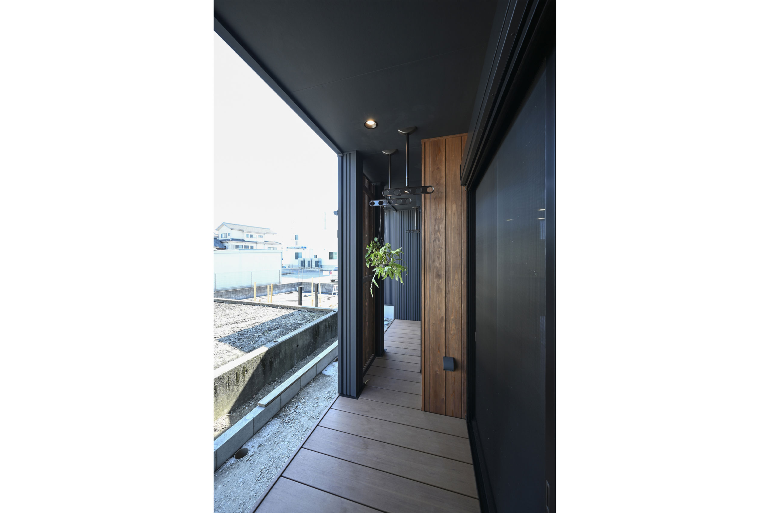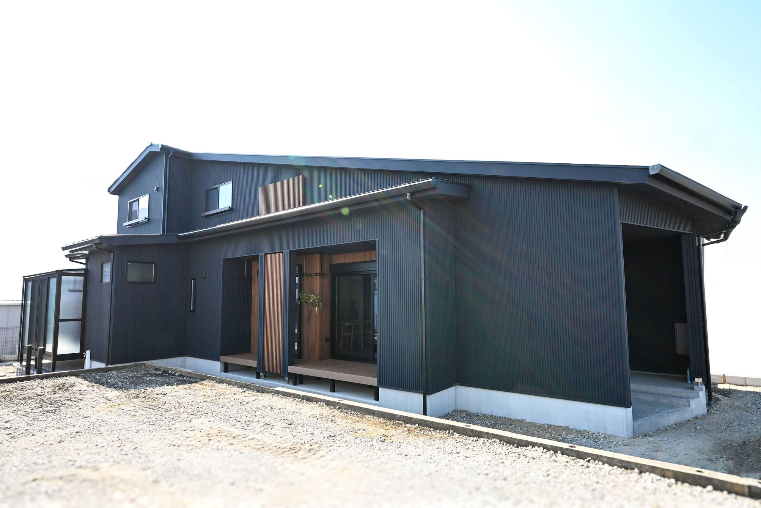 黒ベースのガルバリウムと木格子でデザインした和モダン住宅。