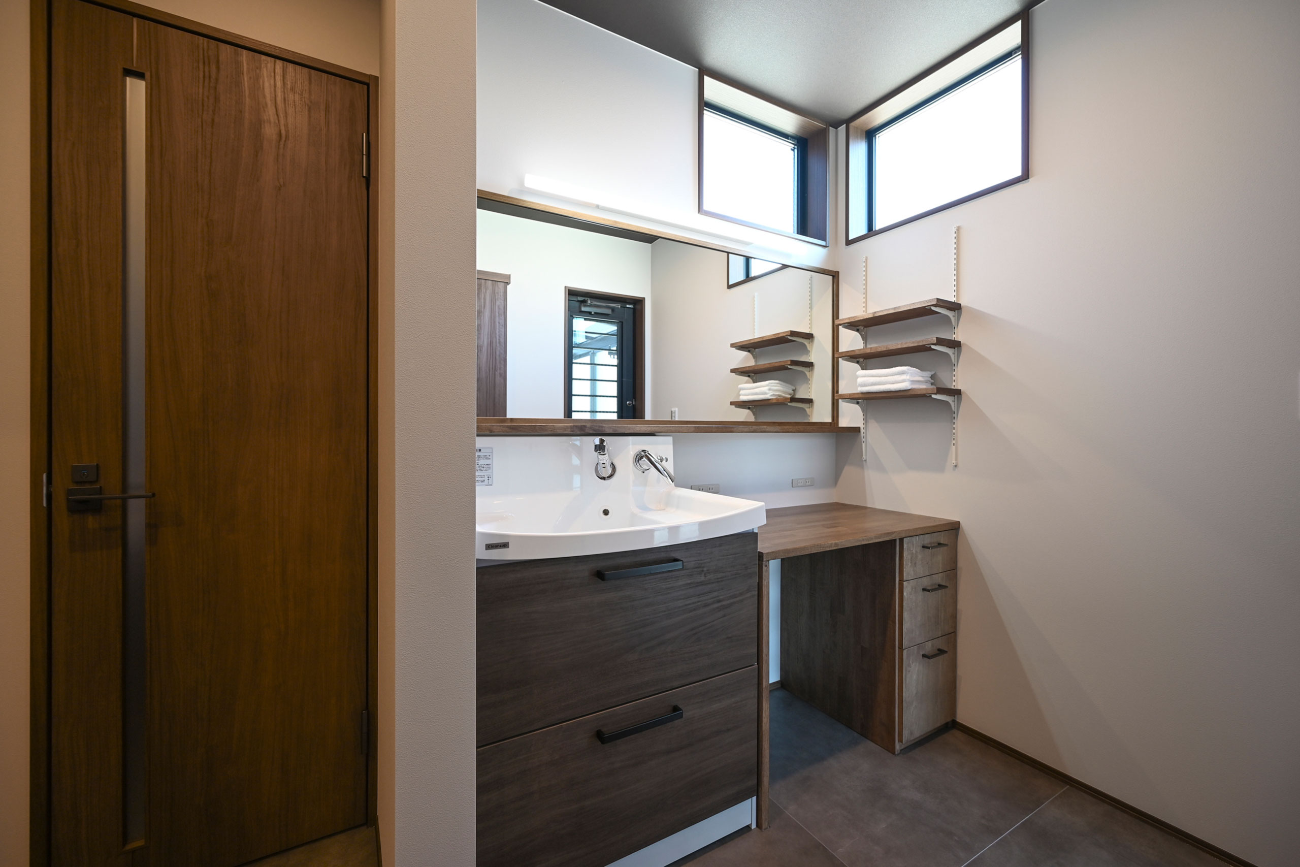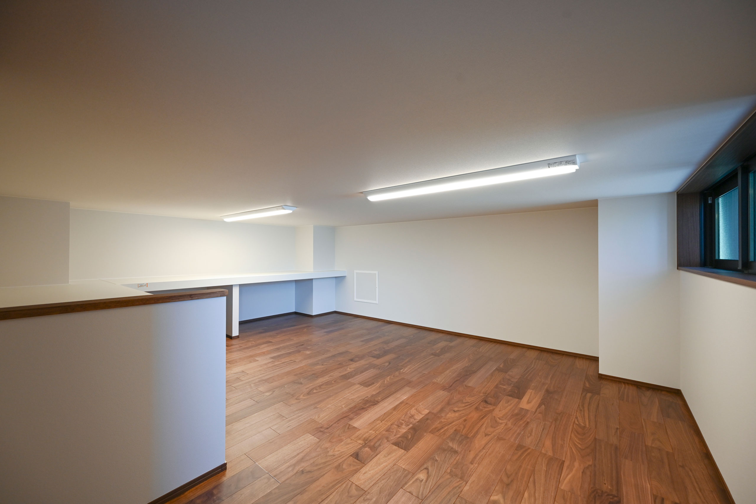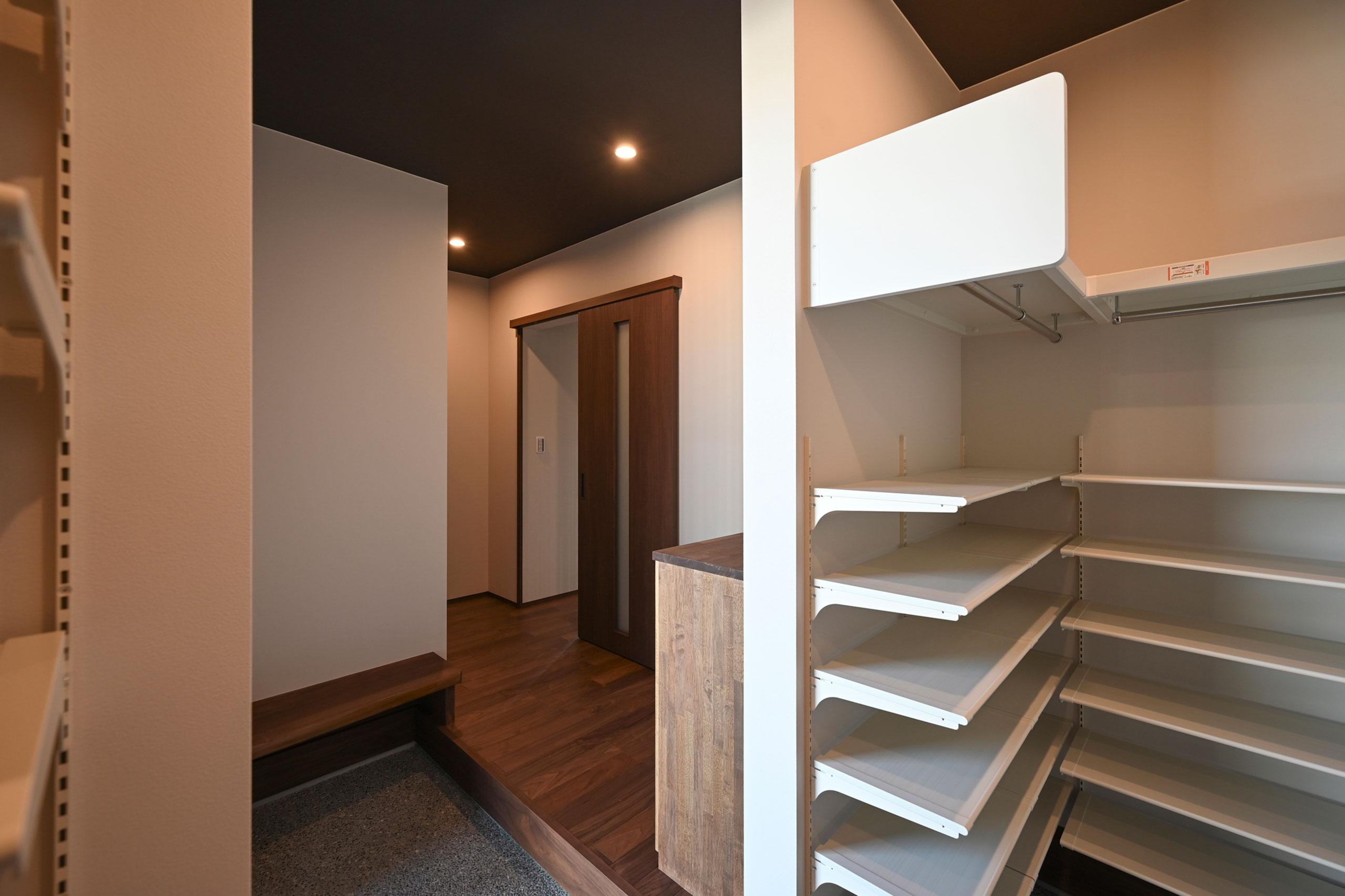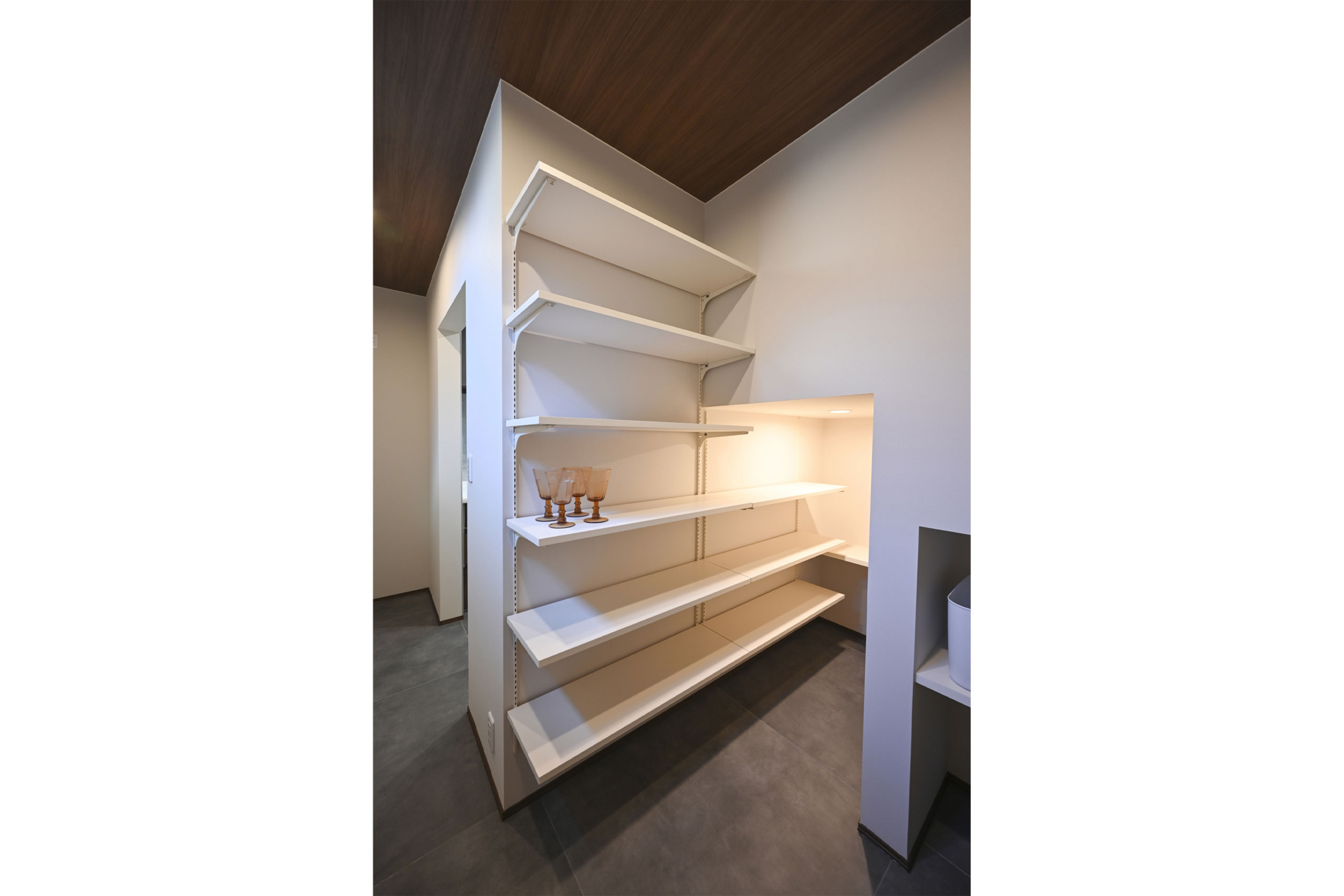 LDKはウッドデッキからの採光で明るく開放的。リビングには畳のスペースを設けて家族がくつろげる空間に。造作のカウンターベンチは、座面の下を収納として活用し、リビングが広く使えるようにしました。すっきりとしたセミオープンのキッチン内には、広いパントリースペースを確保して収納力をアップ。家族や友人とのコミュニケーションが取りやすいのも魅力です