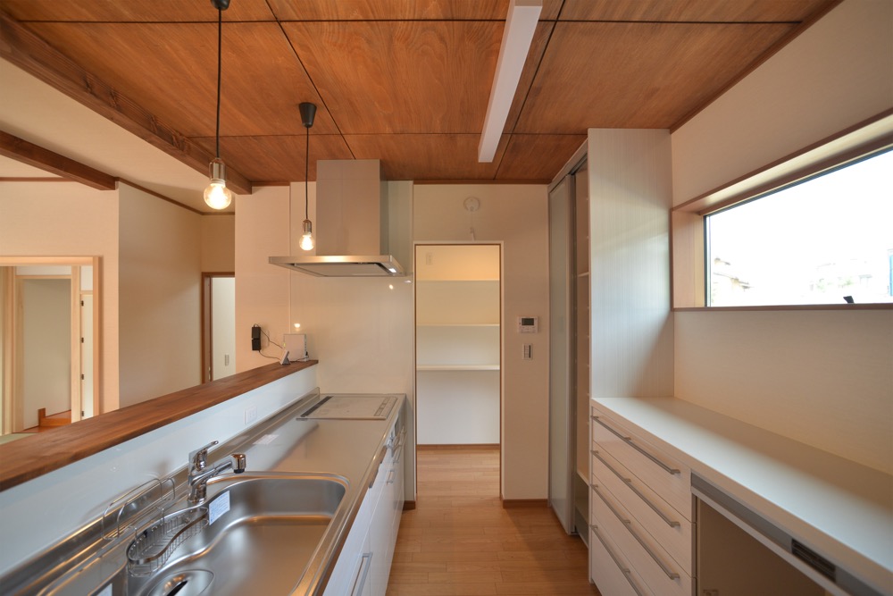 カフェのようなキッチンも、和モダンテイストに。床材はもちろん、天井まで無垢材を使っているので、壁一面にタイルを設けていても、モダンでありながらながら寛ぎの空間になっています。こちらも対面式で、リビング全体や、横の和室まで全てを見渡せます。キッチン横にはパントリーもあり、動線にも配慮しました。