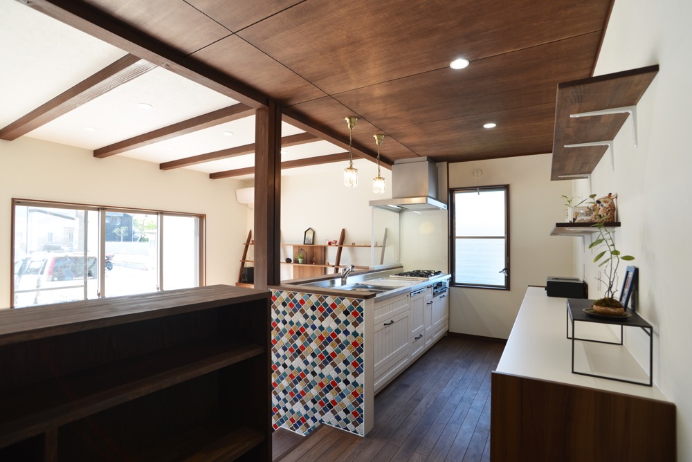 リビングから小上がりになった、対面型キッチン。小上がりになっているので、リビング全体を見渡すことができ、大きな窓からは外の景色も楽しめます。毎日忙しい奥様のために家事楽な動線も考えられています!個性的なタイルですが、落ち着いた木目をふんだんに生かしているのでオシャレなアクセントになっています。