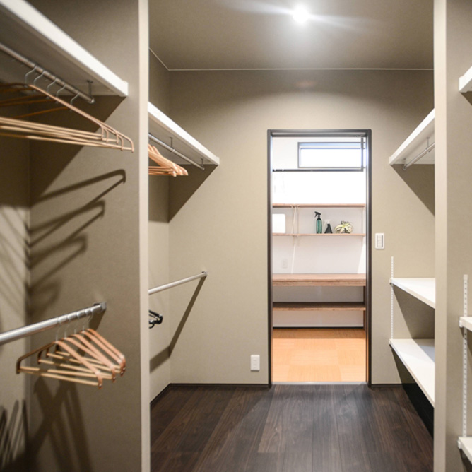 ランドリーとファミリークローゼットを直結させて、干した洗濯物はハンガーのままダイレクトに収納!